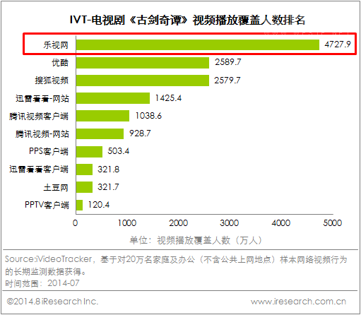 《古剑奇谭》、《卫子夫》在艾瑞IVT-视频播放覆盖人数排名中,乐视网几乎超过第二名、第三名覆盖人数的总和大片看乐视,夯实第一电影营销平台地位
