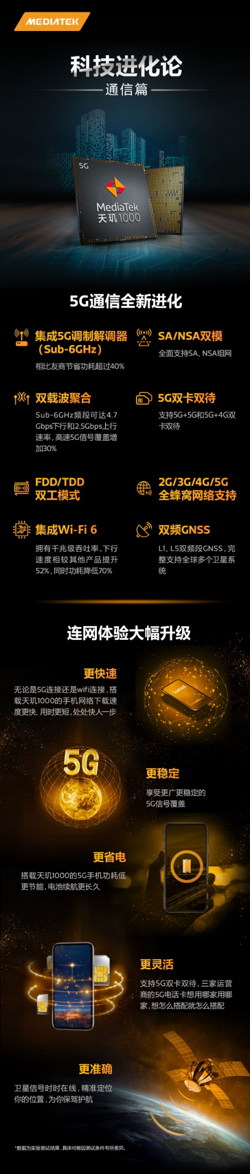 MediaTek天玑1000集成全球最先进的5G基带Helio M70,该基带在研发初期就制定了5G双模双载波等领先的技术架构,特别是对于5G双载波聚合的支持,在提升5G网络覆盖范围的同时可以通过载波聚合实现更快的下载速度,在Sub-6Ghz频段下最高可达下行4.7Gbps、上行2.5Gbps的速度,比友商快了一倍多。除了下载快、信号覆盖广的特性之外,天玑1000采用了自主研发更为先进的电源管理方案,跟其他5G基带相比,可降低约40%-50%的功耗,是全球最省电的5G基带,解决了行业普遍担忧的5G手机功耗过大续航短的问题。