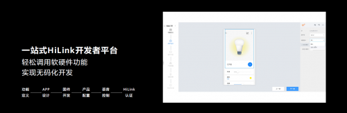 在这种体验水平上完成连接和控制,开发者的开发工作是不是很复杂呢?相反,华为提供了一站式、可视化、模块化的开发平台,从开发到设计、到调控、到上线、到运营,全部可以在这个平台上完成,还提供多种设备的模板,如电视、手表、音箱,它都可以做出相应的配置。