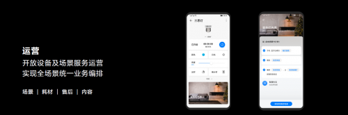 运营包含了两方面的内容,第一,直接在设备卡片的控制界面的下一级就可调用运营界面,包括了购买、售后服务、耗材、内容等等。这些运营内容也在智慧生活卡片里面去完成开发,实现全场景统一业务编排。