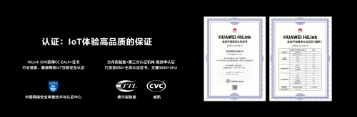 认证分为两种,一种是产品本身的质量认证,华为通过了CC EAL4+的认证标准(EAL4+是IoT领域世界上最高的安全等级),也是目前IoT领域第一个通过该标准的厂家。第二种认证是保障IoT体验的HUAWEI HiLink认证,华为联合泰尔实验室、威凯这两家国内权威认证机构,帮助开发者把认证周期从原来的15天缩短到现在三天,未来甚至缩短到一天。