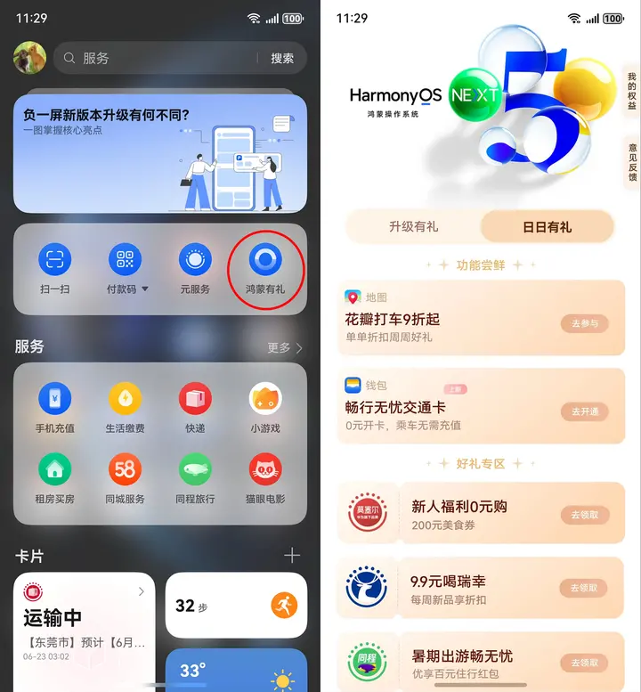 玩累了想找地方干饭?右滑手机进入华为负一屏,“鸿蒙有礼”,直接拿捏省钱攻略。我昨天随手点进“鸿蒙有礼”,从“日日有礼”领了张奶茶店5折券,领完券直接就能在元服务点单,简直不要太方便。现在负一屏还迎来全新升级,什么动态消息置顶、快捷工具拖拽换位、服务拖拽替换、服务卡片自定义添加等功能全都有。特别喜欢那个动态消息置顶,各大平台的快递信息一目了然,再也不会因为买的东西太多,快递信息一团乱麻了。